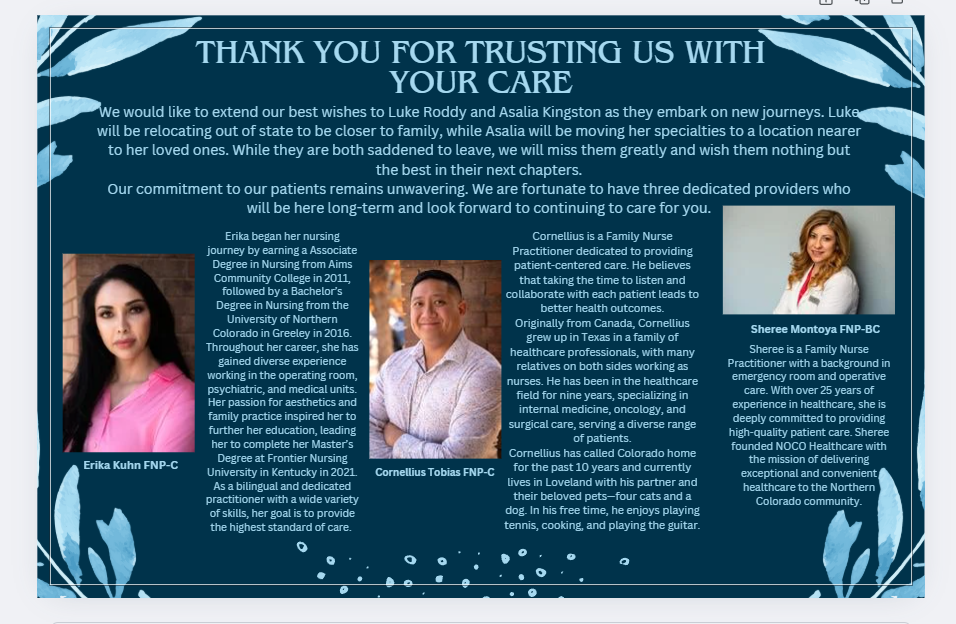 Welcome to NOCO Healthcare. We were founded because we believe patients should be treated like family, not units. We believe healthcare should be convenient and affordable to those who need it. That is why our office is small but our offerings are vast. What ever you need we are here to help and if we can’t we will make sure we find who can. Remember the days when your provider felt like a trusted friend? We do, and that is what we are bringing back to Northern Colorado.